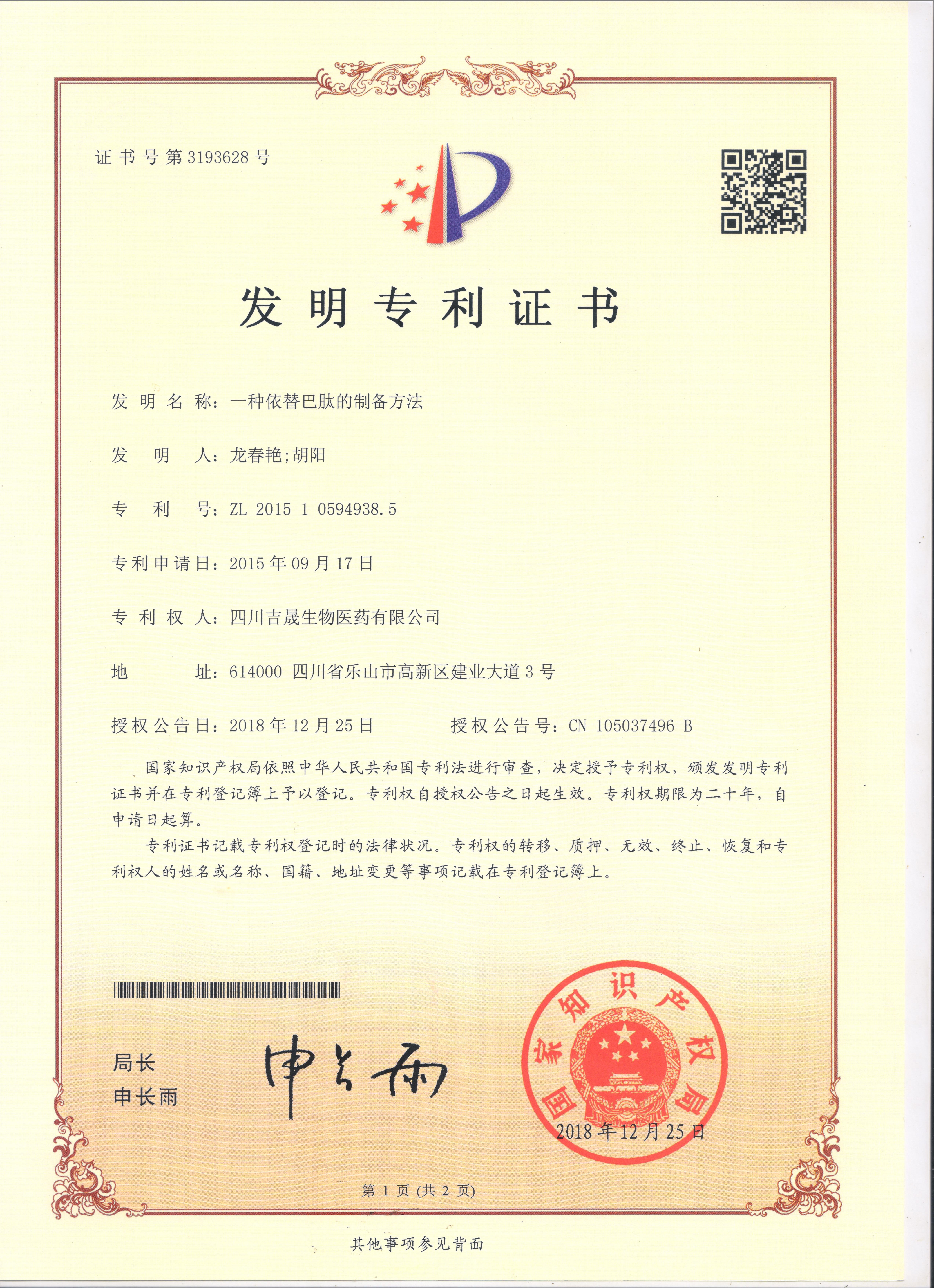 |                       生物發(fā)酵專(zhuān)利                                                                   依替巴肽專(zhuān)利                                                   鮭魚(yú)降鈣素專(zhuān)利 |